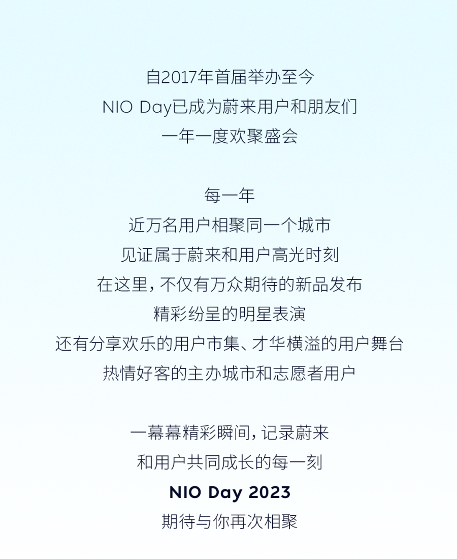 NIO Day蔚来日,是蔚来和用户朋友们一年一度的聚会。NIO Day 2023主题为“向上”,它代表着对生活的热爱、对未来的信心。