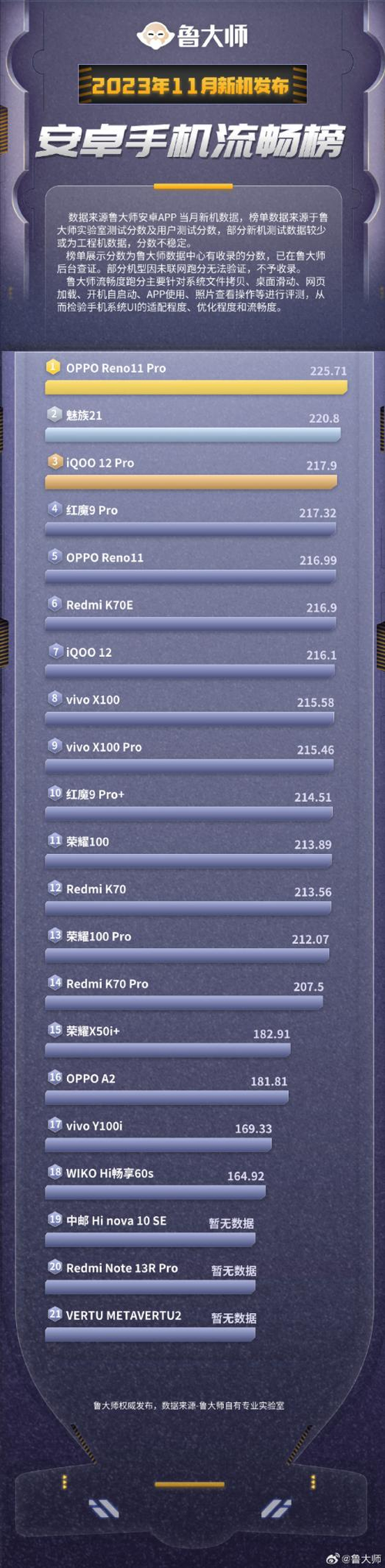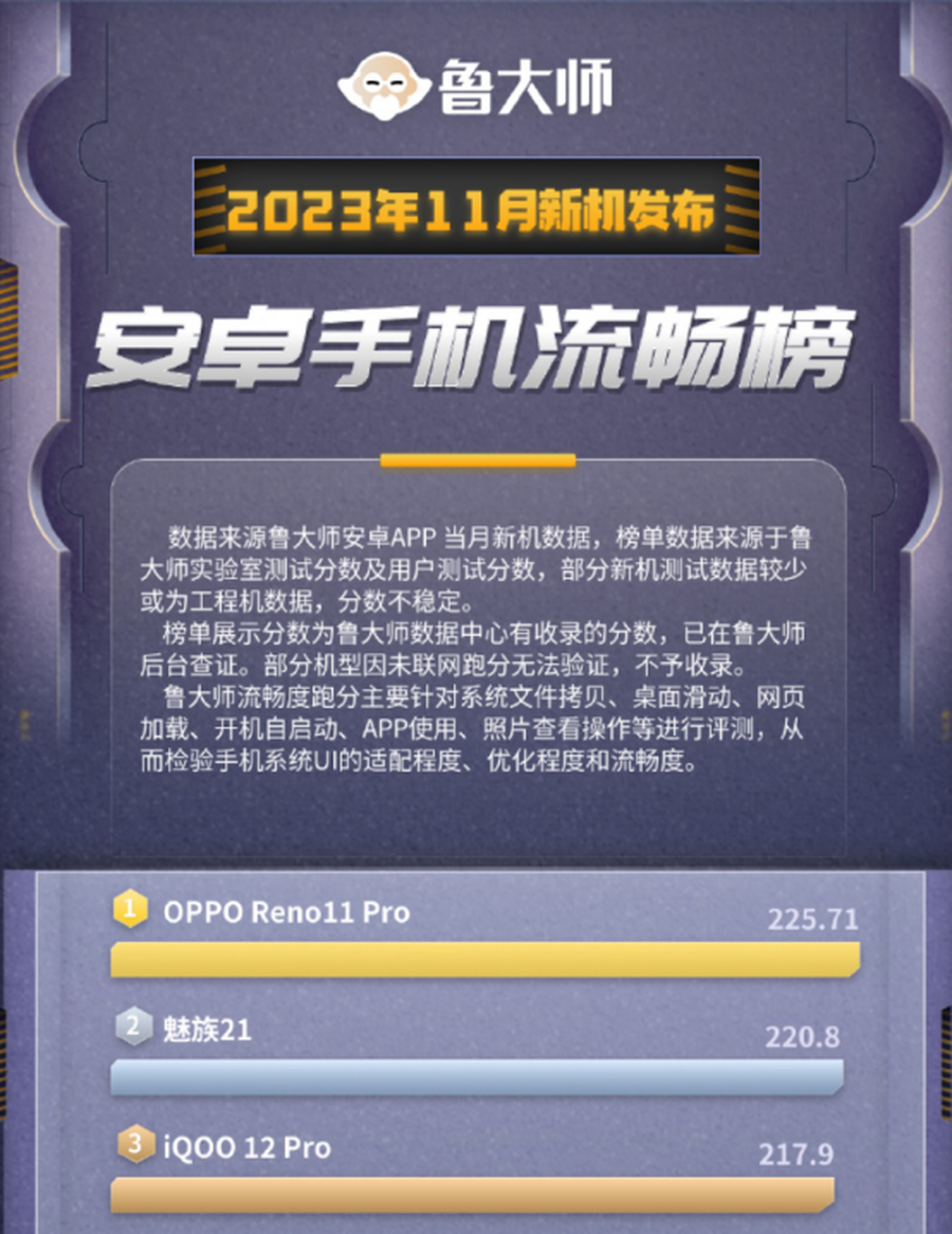 日前,鲁大师公布了基于11月新机整理的三大榜单,分别是安卓手机性能榜、安卓手机流畅榜以及安卓手机久用流畅榜。作为刚刚发布的新机,OPPO Reno11 Pro也成为11月安卓手机流畅榜的No .1,在久用流畅榜中,OPPO Reno11 Pro也获得了第5名的好成绩。