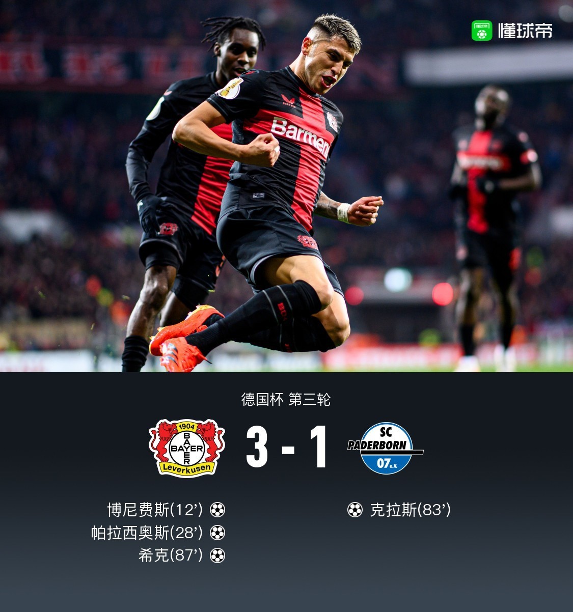 北京时间12月07日德国杯 第三轮,勒沃库森主场对阵帕德博恩。此役,博尼费斯、帕拉西奥斯与希克分别建功,弗林蓬完成助攻双响,克拉斯扳回一城,维尔茨伤退。最终,勒沃库森3-1击败帕德博恩,晋级德国杯八强。
