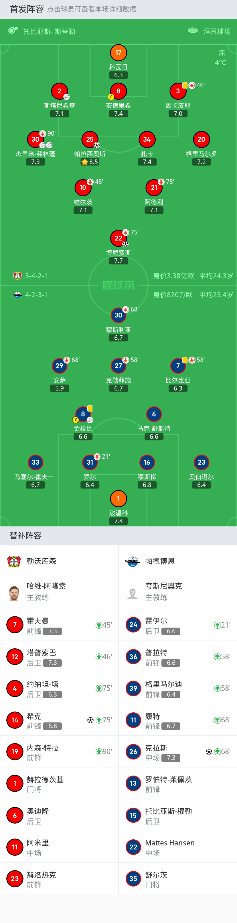 勒沃库森首发:34-扎卡, 20-格里马尔多, 8-安德里希, 25-帕拉西奥斯, 2-斯塔尼希奇, 17-科瓦日, 30-杰里米-弗林蓬, 22-博尼费斯, 3-因卡皮耶, 21-阿德利, 10-维尔茨