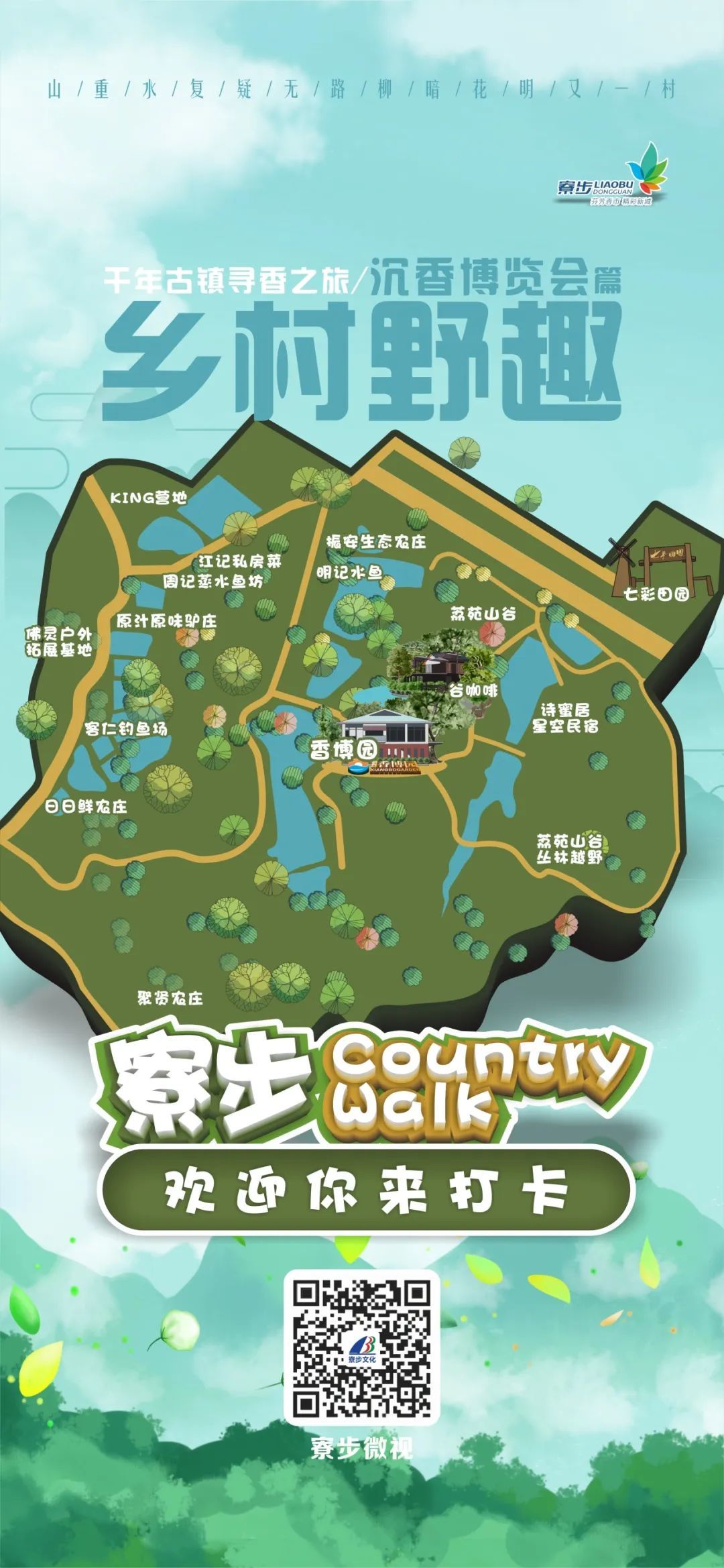 香博园是香博会的分会场,在这里,你可以了解莞香的种植、开花、结果及结香过程。寮步的传统乡村风情也是一大亮点。游客可以到荔苑山谷、七彩田园、明记水鱼等农庄,体验乡村野趣。