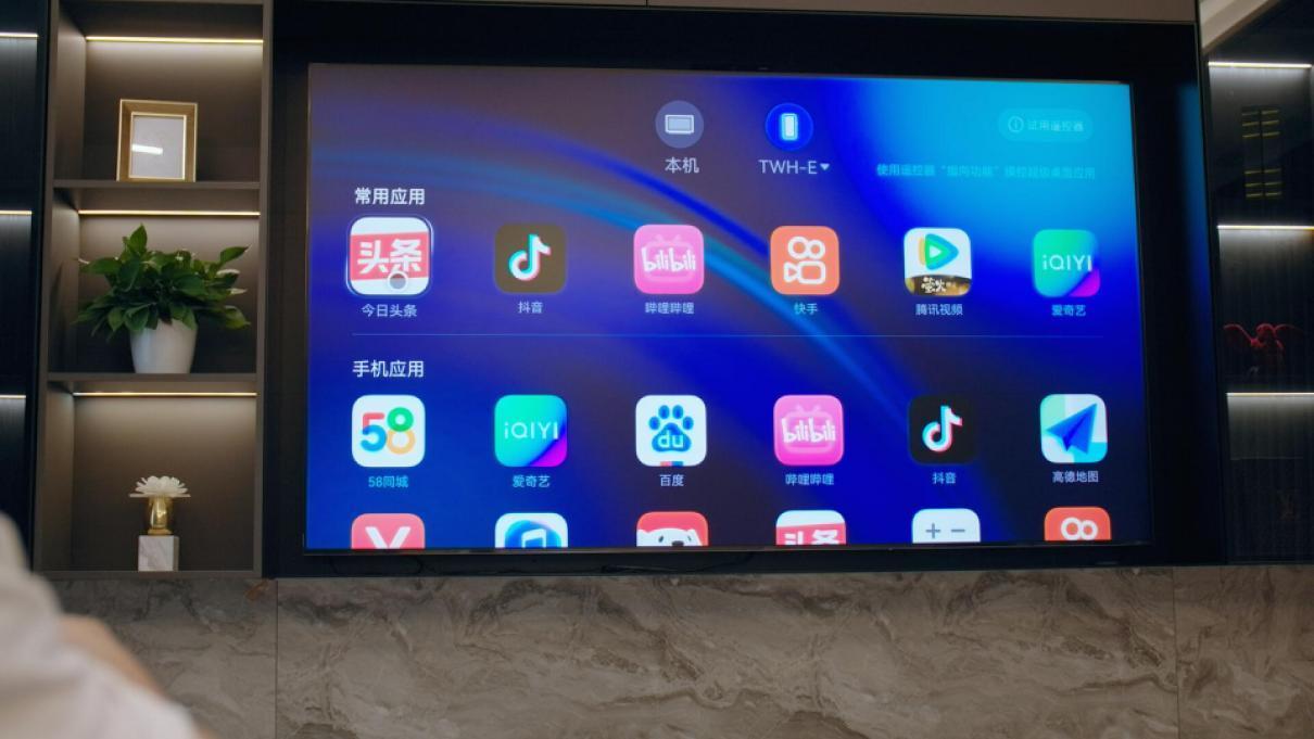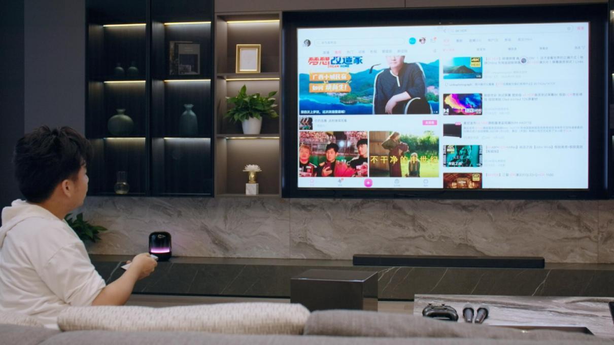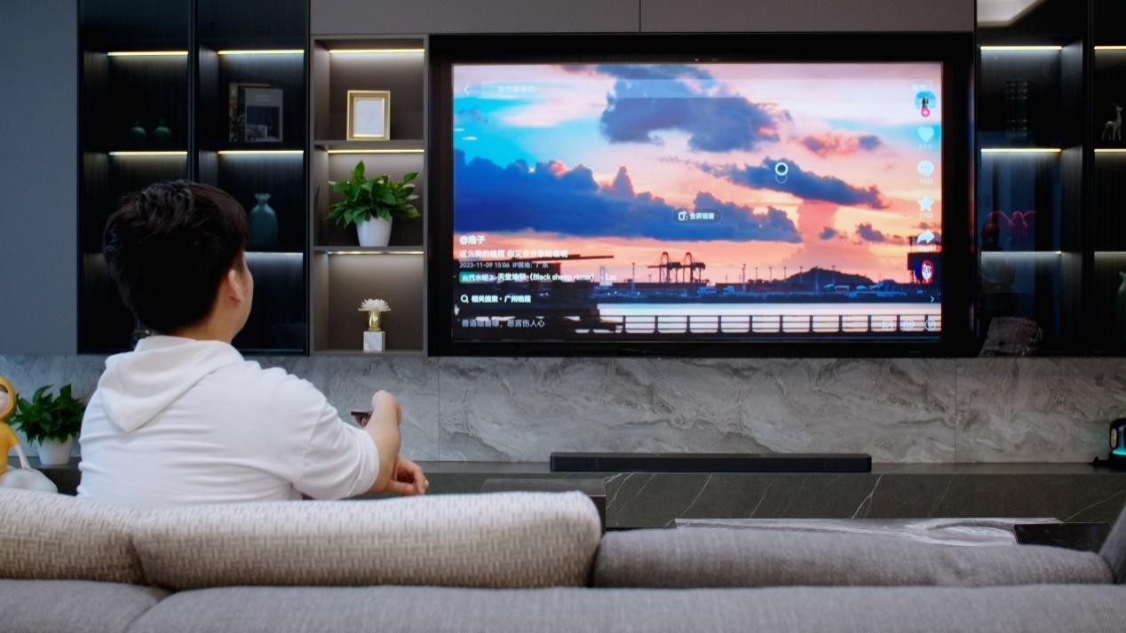 更超乎想象的是,像是抖音这种短视频应用,也能在这块大屏上显示,配合独特的遥控器,可以实现随手滑动切换下一条的熟悉操作,让智慧屏化身“98 英寸超大屏手机”,与全家分享你偶然刷到的新乐趣。