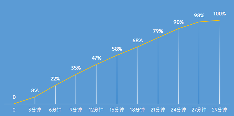 真我 GT5 Pro 内置 5400 毫安时大容量电池,并且支持 100W快速充电, 12 分钟可以充 电 47%,充满只需 29 分钟,不仅充电快,而且配合 AI 智能充电算法可以有效防止电池 老化,实现 1600 次完整充放电循环后,电池有效容量不低于 80%,可以让手机电池支持 4 年的使用时间。