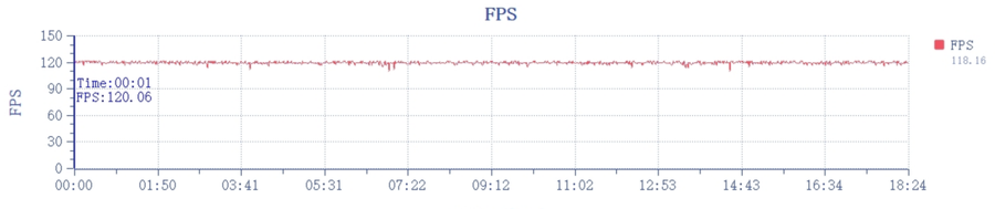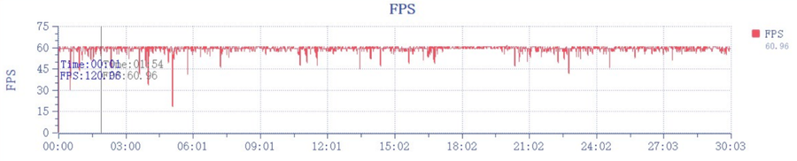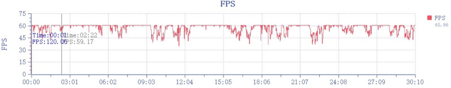 在游戏测试中,《王者荣耀》选择极高帧率 、超高分辨率以及极 致画质,最终平均帧率达到了 119 .8FPS,游戏过程非常流畅,没有卡顿的情况。