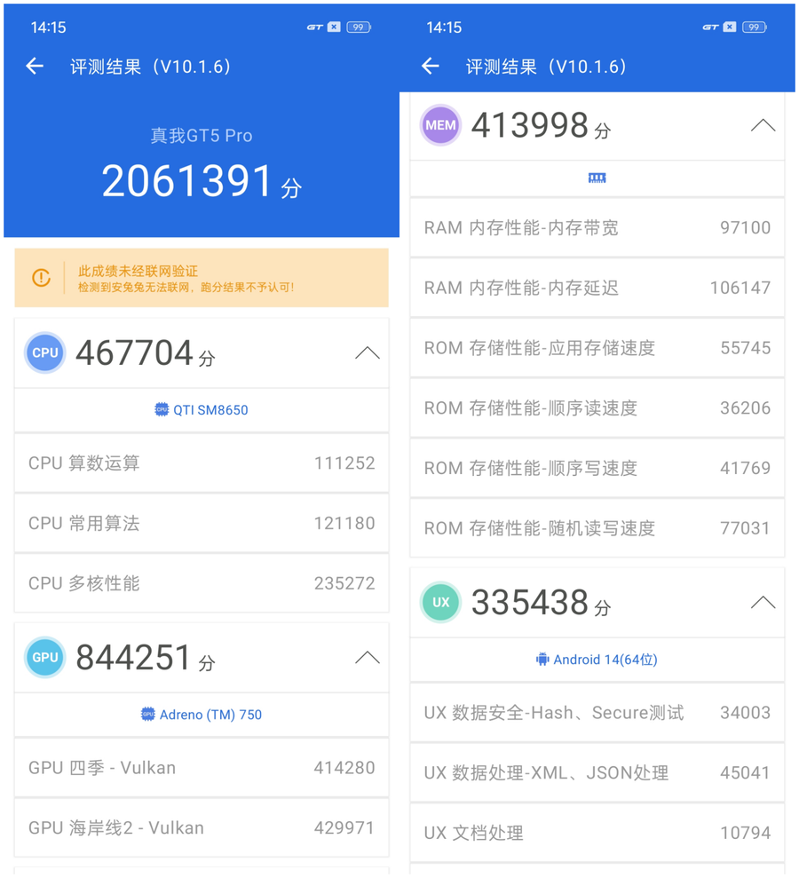 经过实测,真我 GT5 Pro 的安兔兔跑分也已达到 206 万分。