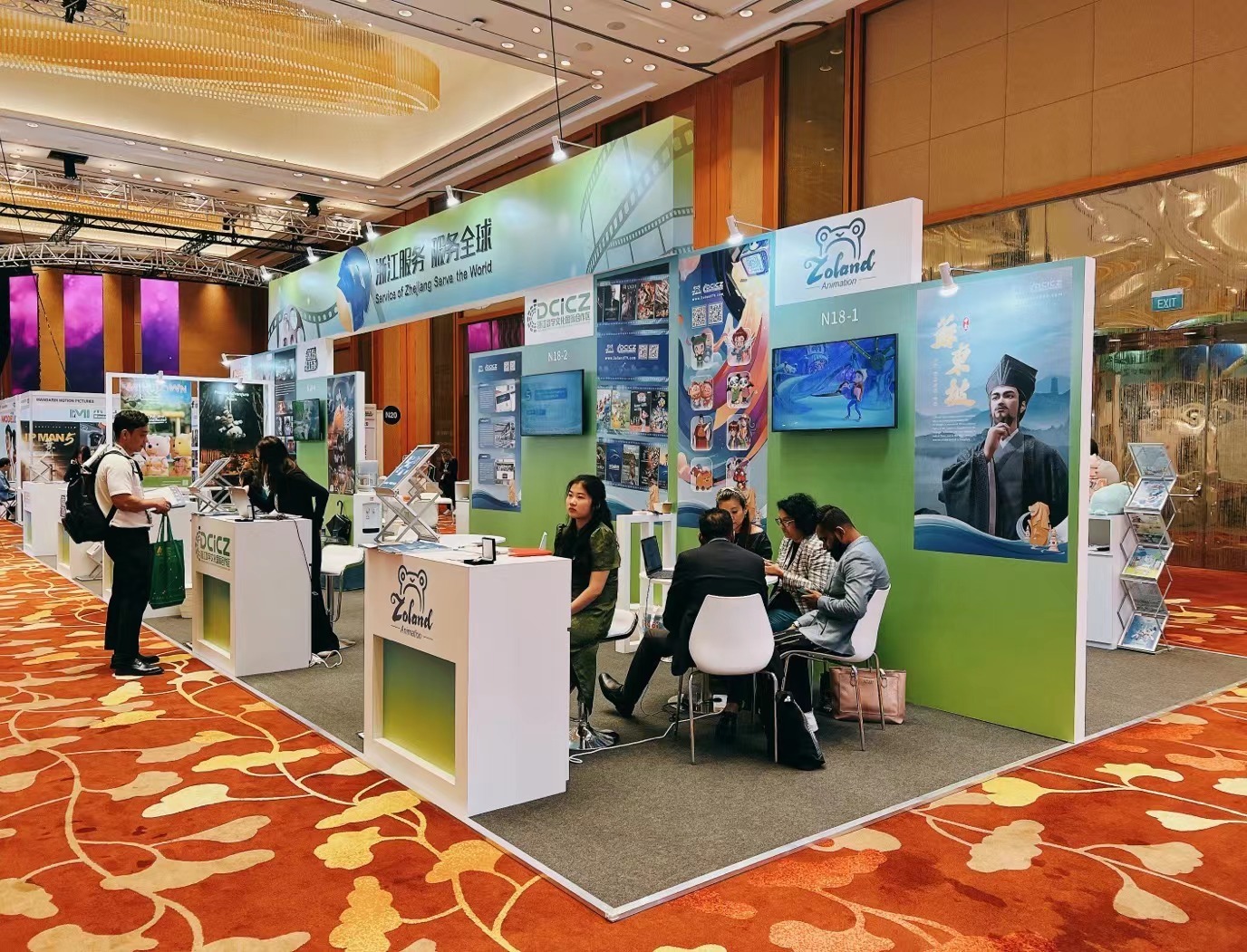 浙江企业带来了诸多作品,集中展示了影视服务、数字媒体、技术服务等领域的最新成果。如中南卡通携《苏东坡与杭州的故事》、《九域》等全新作品和《天眼归来》系列、《乐比悠悠》系列等经典IP,以及代理发行的《冒险小狗帮》《变形联盟之超变战神》等数十部作品亮相ATF。浙江数字文化国际合作区带来了海外交易平台、“版钉”一站式版权保护平台、“之江一号”AI表演动画平台。中国国际动漫节于ATF宣传金猴奖参赛、推动国际动漫游戏商务大会(iABC)招商工作,吸引境外企业与浙江动漫影视企业项目落地、互相输出。杭州通和辰光携原创IP《桃花猫和东海鱼》、《奇幻水晶晶》、《小神驾到》等系列动画片、浙江中创华视推出阿u系列动画以及《暮色心迹》《掌中独宠》等网剧作品参展、蒸汽工场携《口袋森林》,《口袋探险队》和首部动画电影《糖果狂想曲》、东阳传驿人影视文化有限公司带来了马伯庸同名新作改编作品《长安的荔枝》、华麦网络携音视频内容跨境交易服务平台MEGA MEDIA以及平台上优质的中国内容参展,助力中国影视开拓海外市场,向参会人员推介iABC 及MIPCHINA,大昱光电展示了微晶3D沉浸系统。凭借优秀的作品和技术服务方案,结合视频、画册等展示形式,浙江展区吸引了众多国际买家。通过在展区内开展一对一洽谈,与全球制作商、发行商、委托方和投资机构面对面交流,寻求合作机会。