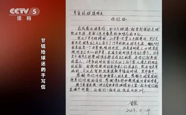 最后,甘锐还通过节目,亲自读出了自己给球迷的手写信:“亲爱的球迷朋友们,你们好。在凤凰山体育场,和全场四万名球迷一起告别我的足球职业生涯,是我人生中最美好的回忆,我从5岁开始踢球,20岁第一次登上中超赛场,到今天我决定结束自己为之奋斗了19年的职业生涯,这对于我来说是一个非常艰难的决定,但是有时候人必须学会倾听自己内心的声音,在适当的时候告诉自己停下。2018年至今,我早已把蓉城俱乐部当做自己的家,而你们就是我的家人,6年多的时间,我们见证了这个家从刚建立,到现在的成就,我很难跟我的家,和家人们说再见。”