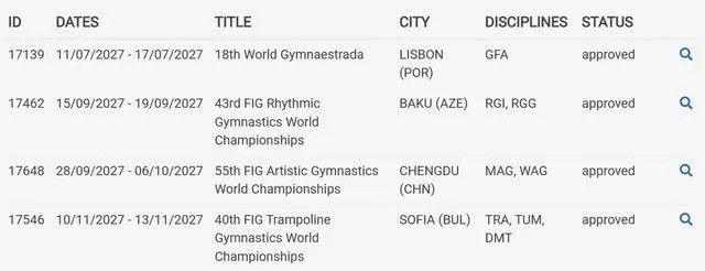 北京时间12月8日,国际体操联合会在其官网更新赛历,宣布中国成都获得2027年第55届世界体操锦标赛举办权。