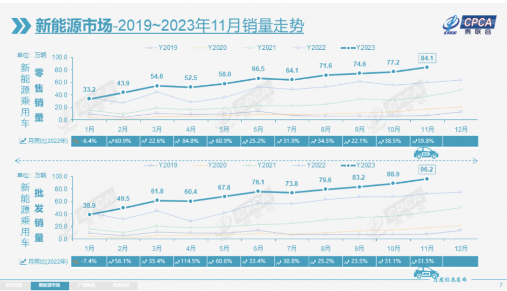 数据显示,2023年11月,国内乘用车市场零售量达到208万辆,同比增长26.0%,环比增长2.4%。今年乘用车累计零售1934.5万辆,同比增长5.3%。其中,新能源乘用车零售84.1万辆,同比增长39.8%,环比增长8.9%;今年以来累计零售680.9万辆,同比增长35.2%。