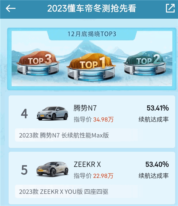 在纯电车冬季续航测试项目中,懂车帝提前公布了第四至第十四名的车型成绩,而前三名的成绩详情,懂车帝则把悬念留到12月底揭晓。