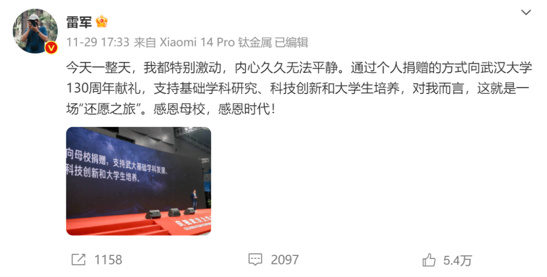 捐款当天晚上,雷军发文称激动一整天:“今天一整天,我都特别激动,内心久久无法平静。通过个人捐赠的方式向武汉大学130周年献礼,支持基础学科研究、科技创新和大学生培养,对我而言,这就是一场还愿之旅。感恩母校,感恩时代。”
