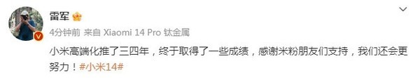 【手机中国新闻】12月11日,小米董事长兼CEO雷军在社交媒体上发布微博,宣布小米高端化战略取得了显著成果。他表示,经过三四年的努力,小米终于在高端市场取得了一些成绩,并对米粉朋友们的支持表示感谢。雷军称小米将继续努力,为用户提供更优质的产品和服务。