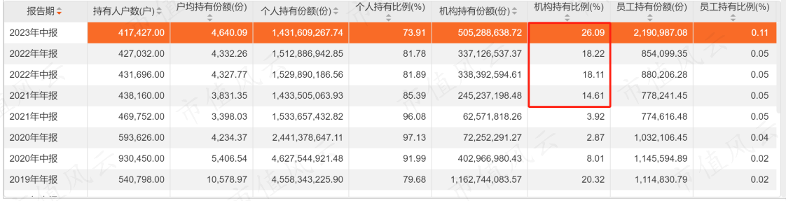 这样的业绩也得到了机构的认可。2021年底机构持有比例开始上升,到2023年中报,该比例已达到了26.1%。