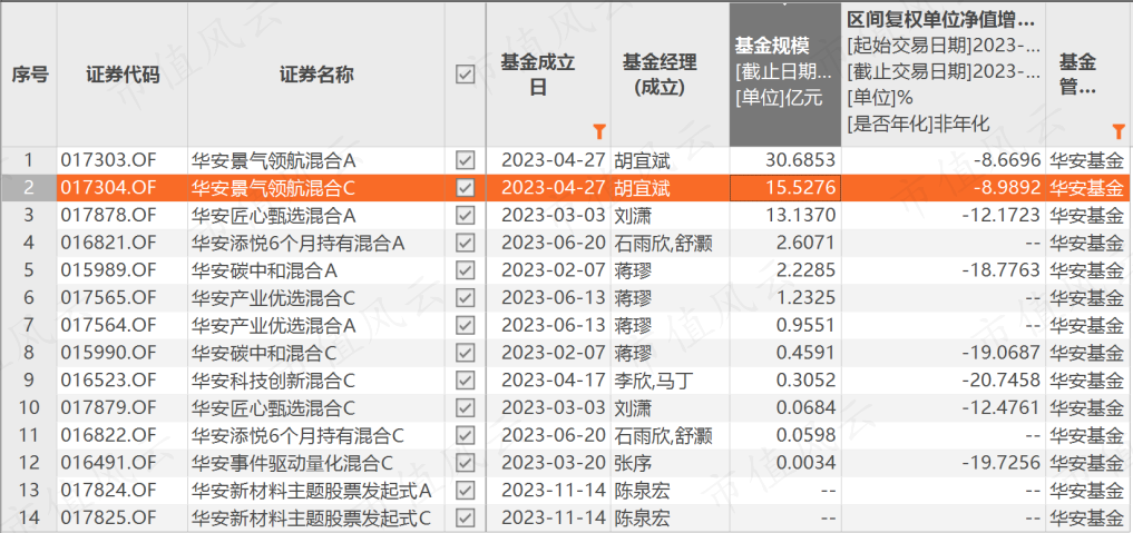 今年公募基金发行遇冷,年内华安基金共发行了14只权益类基金,属胡宜斌比较吸金。华安景气领航混合A/C在2023年4月成立,目前基金合计规模已超过45亿,可见他还是具备一定影响力。
