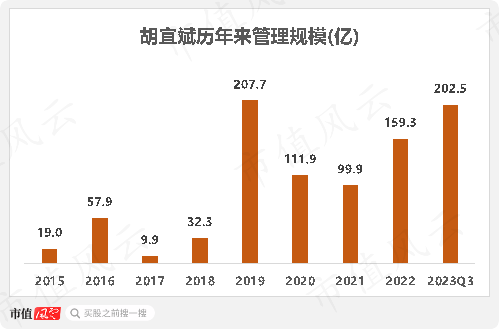 2015-23年,胡宜斌的管理规模不算稳定。而2015年、2019年及2021年三个他分别接任新基金的时间点正是他职业生涯三个重要的转折点。