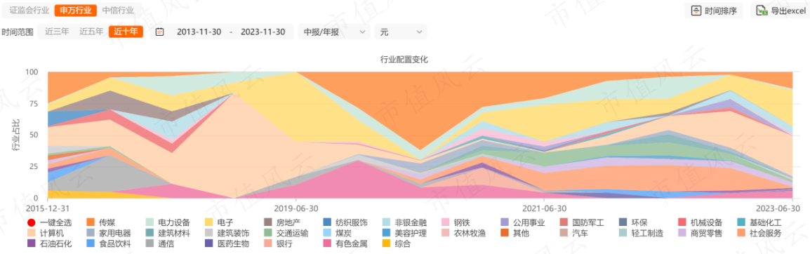 于是,他开始逐步加配低波动的板块,在不同的宏观周期加入有色金属、银行、社会服务、交通运输等板块,同时用TMT领域下的通信、计算机、电子、传媒板块去博取高收益。