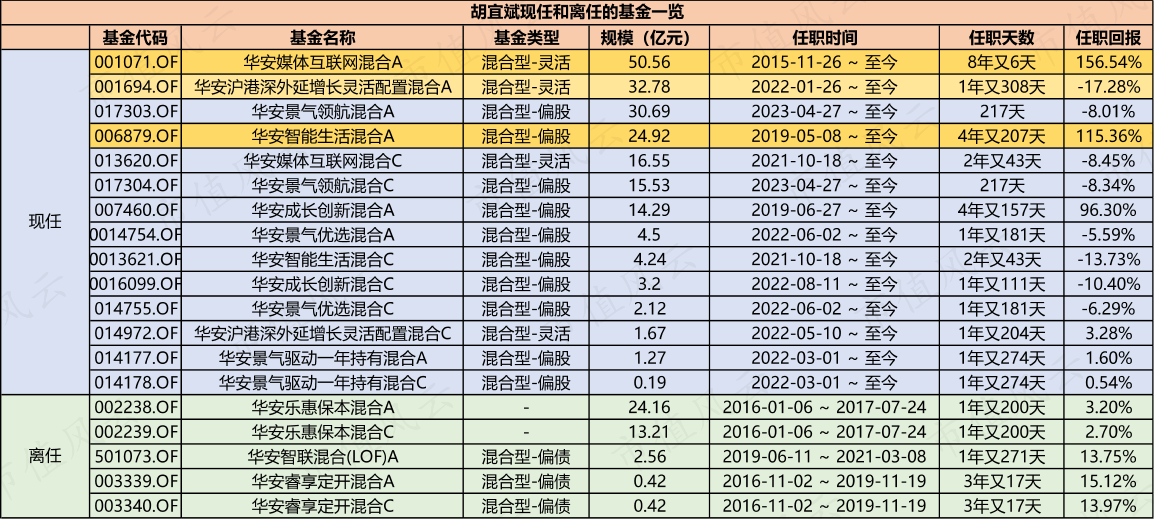 但2021年以后上任的四只基金任职回报均收负,表现最差的当属华安沪港深外延增长灵活配置混合A。当年崔莹凭借这只网红基跑出任职回报率高达360.3%的战绩后就跑到私募玩去了,胡宜斌接手后,任职回报率亏损17个点。