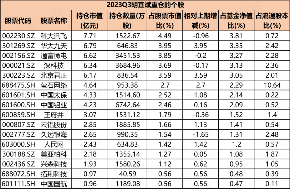 但对于科大讯飞,他是坚定看好。虽然股价在三季度大跌37%,但胡经理基本没有减持,仍然拿着超1500万股,合计市值超7.7亿。