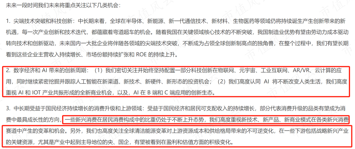 而在杠铃策略的另一端,他提到了两点,一个是新兴消费的机会,另一个是在清洁能源的上下游去挖掘。