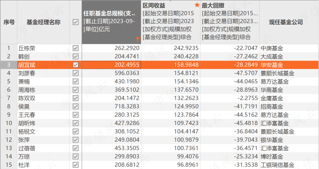 上岗8年,胡经理成绩相当不错,自他从业以来,他的按规模加权收益率累计为158.9%,在三季度末管理规模超200亿以上的基金经理群体中排在第三位,力压刘彦春、周海栋、杨锐文等一众顶流老将。