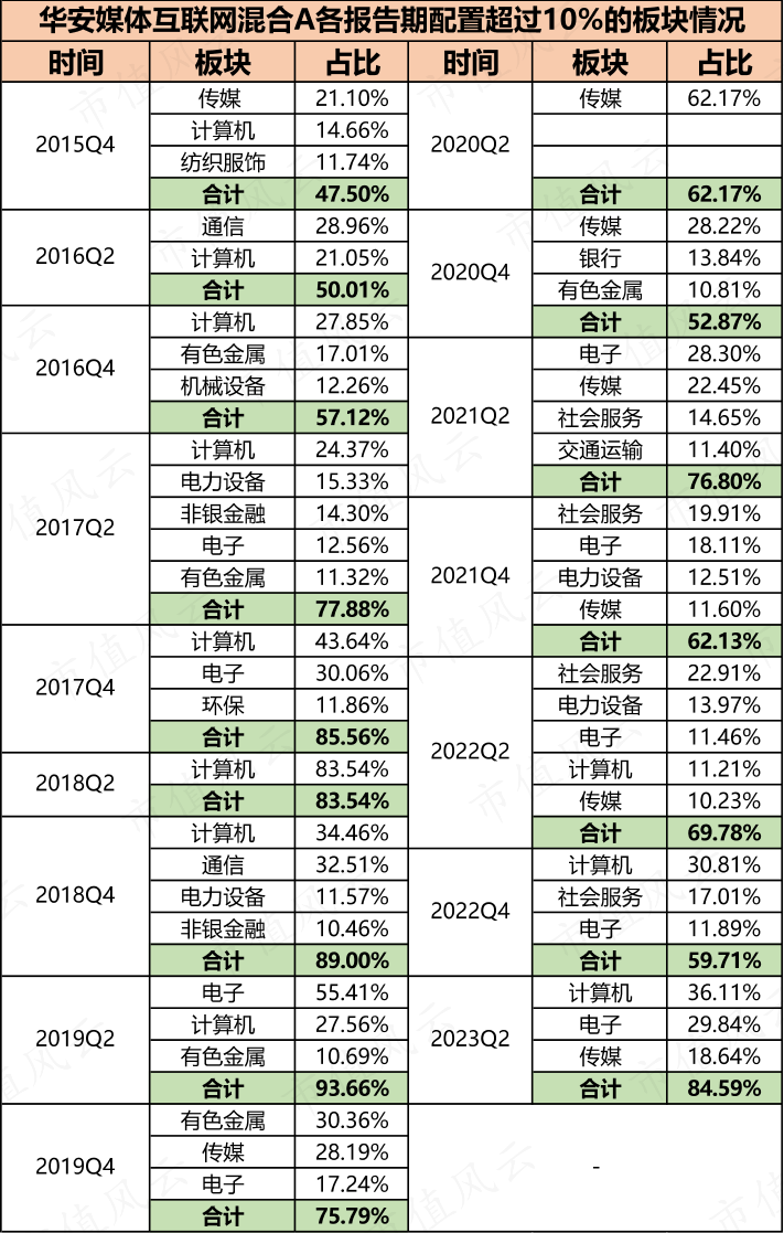 申万31个板块,胡宜斌仅重仓过11个。但2020年以后像单压计算机或者传媒板块,比例超过60%甚至到80%的情况极少出现过。