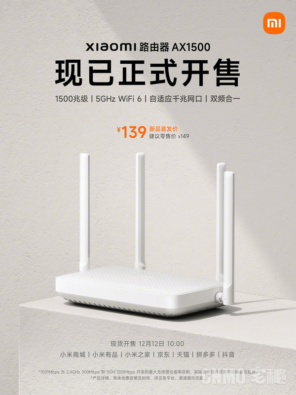 12月12日,小米路由器官方宣布,入门级WiFi 6小米路由器AX1500现已正式开售,超值性价比仅需139元。