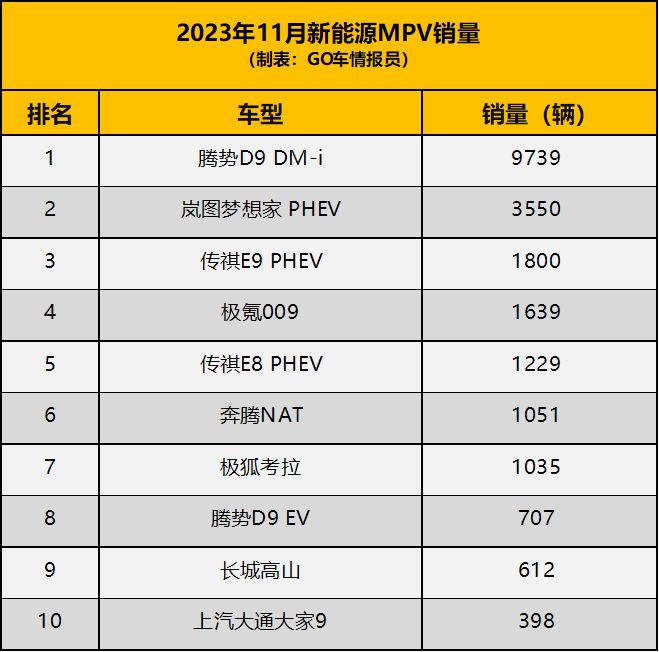 榜单后半部分都是一些比较边缘化的车型,极狐考拉主打亲子和宝宝专用,上市不久,卖出了1000多辆。腾势D9 EV销量不如DM-i的十分之一,值得行业研究,纯电MPV为什么不吃香呢?长城高山刚上市,11月仅卖了612辆,但是山高水长,大家都还有机会。