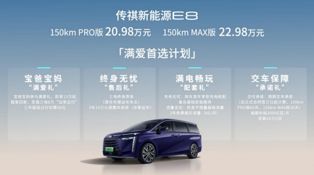 继今年5月首款新能源MPV传祺E9上市后,11月广州车展上,第二款新能源MPV——传祺E8上市,共推出两款车型,官方售价分别为20.98万元和22.98万元。12月9日,传祺E8正式开启交付。