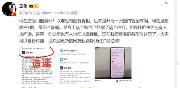 【手机中国新闻】12月13日,手机中国注意到,小米王化发文:现在造谣门槛真低!以前是有图有真相,后来是开局一张图内容全靠编,现在是随便P张图,带完节奏删。某音上这个账号已经删了这个内容,但是社群里面还有人来问询,甚至一些论坛也有人也在以讹传讹。现在我把真实的截图放这里了,大家可以自行对照,也欢迎更新的网友甄别帮我们扩散澄清!