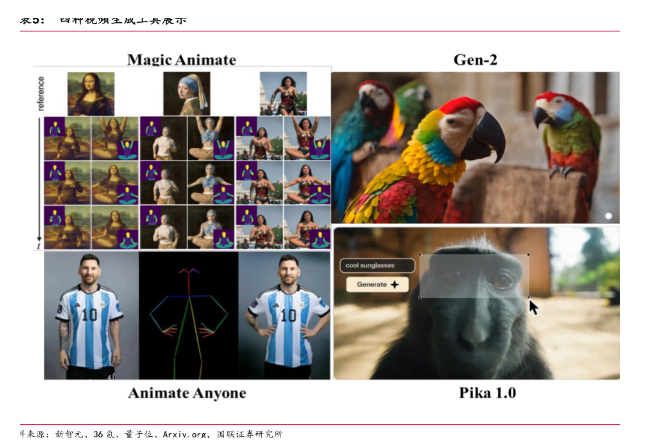 近期,AI视频生成领域进展不断,海内外多家企业先后推出相关AI视频生成工具或对原有的产品进行及时更新。国内看,11月27日和28日,字节和阿里相继发布了图生视频项目相关论文,阿里推出了AnimateAnyone,新加坡国立大学和字节跳动则联合推出了MagicAnimate。AnimateAnyone由阿里巴巴智能计算研究院开发,通过优化的扩散模型让静态任务生成动态视频,创作者只需提供静态的角色图像(包括真人、动漫/卡通角色等)和一些动作、姿势(比如跳舞、走路)即可将其动画化,同时保留角色的细节特征(如面部表情、服装细节等)。MagicAnimate是新加坡国立大学和字节跳动联合推出的“人体图像动画生成器”,能够把指定的人物图片按照既定动作序列生成视频。