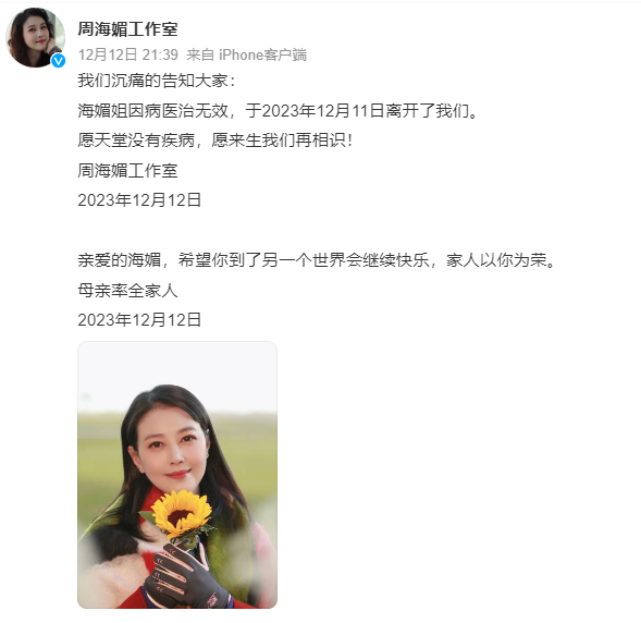12日21:39分,周海媚工作室在微博发文,演员周海媚因病医治无效离世。