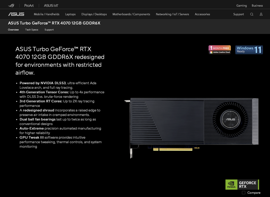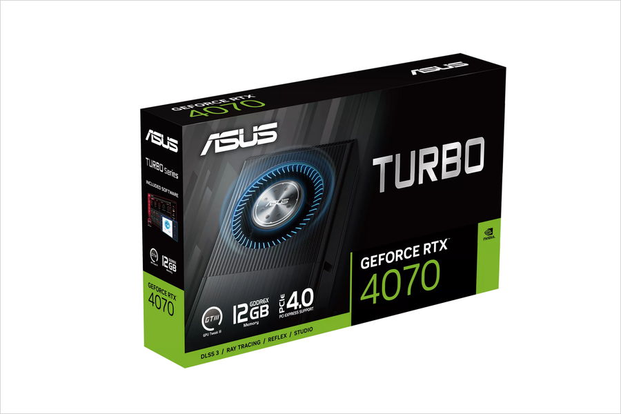 华硕推出了一款采用涡轮散热设计的RTX4070显卡,它就是华硕Turbo GeForce RTX 4070 12GB GDDR6X。