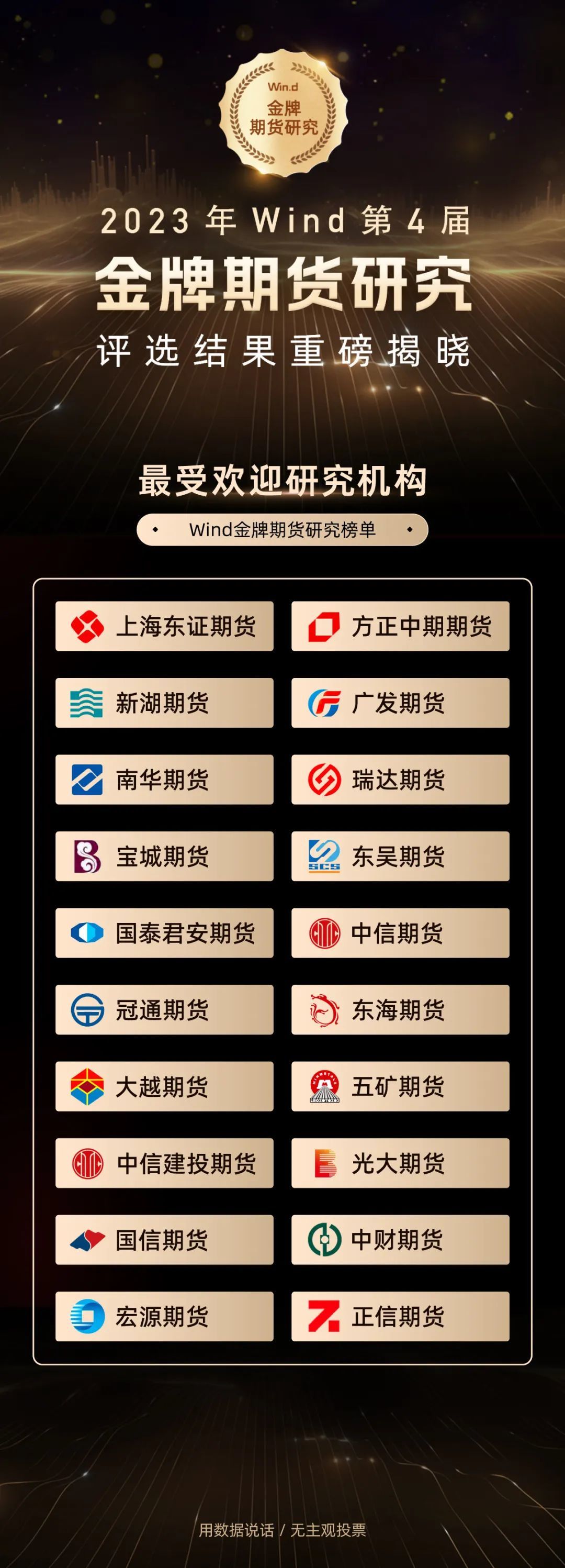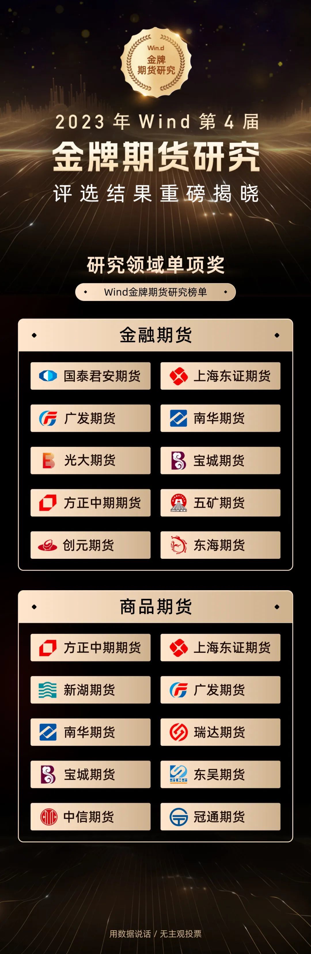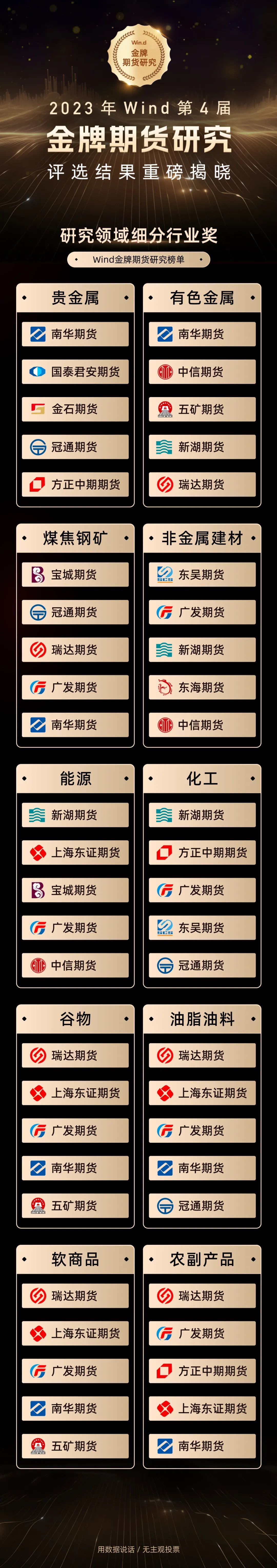 12月15日,2023年Wind“金牌期货研究奖”评选结果正式揭晓。本届评选仍以“万得平台卖方机构研究报告阅读数”这一客观指标作为评选依据,在保证数据独立公正的基础上,最终形成评选结果。本届评选共设立研究机构综合奖及研究领域单项奖,以及10个商品细分行业研究奖,共有22家期货公司获奖。