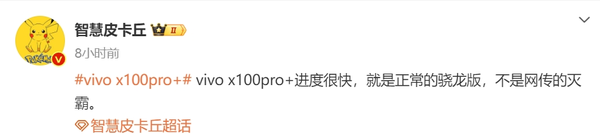 【手机中国新闻】此前,vivo举行了新品发布会,推出了vivo X100系列。新机一经发布便吸引了很多消费者的关注,而该系列的超大杯版本Pro+有望明年三月份推出。虽然距离发布日期还有一段时间,但网上逐渐浮现出关于该机的爆料。12月15日,手机中国注意到,有数码博主爆料,vivo X100 Pro+的研发进度很快,它是一款正常的骁龙版本手机,而不是网络上流传的“灭霸”版本。