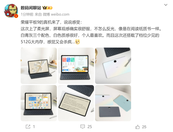 12月15日上午,数码博主@数码闲聊站 曝光了荣耀平板9的外观设计。新平板的居中镜头设计和全新配色让人眼前一亮。