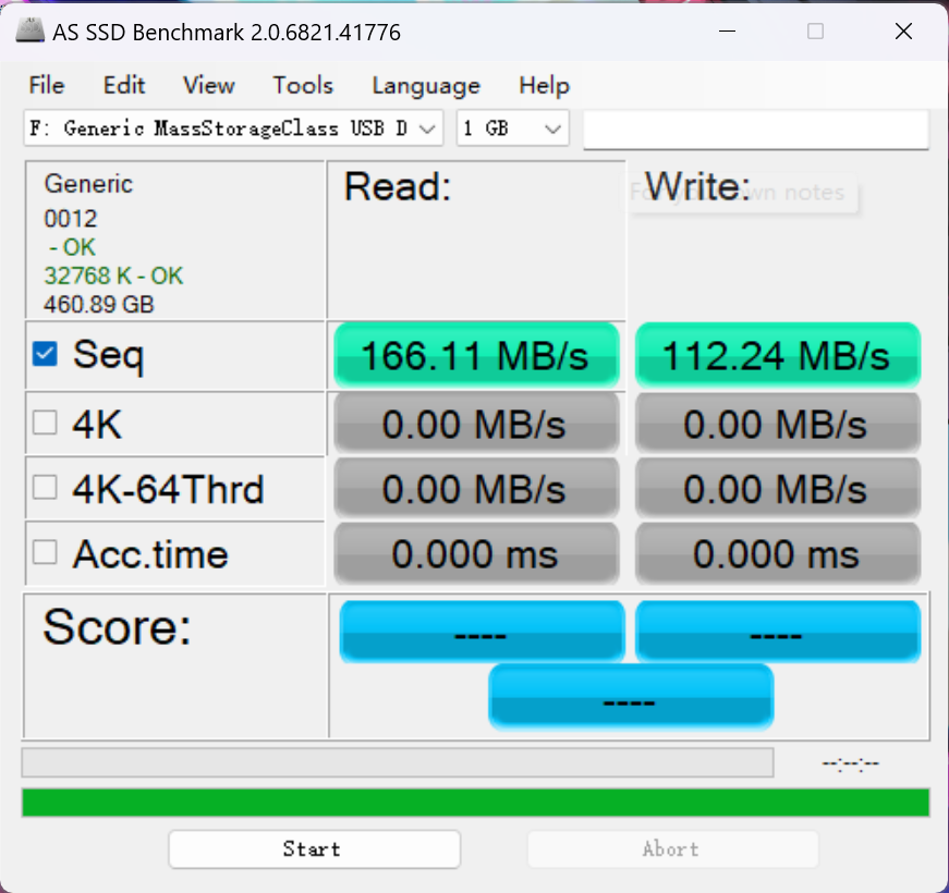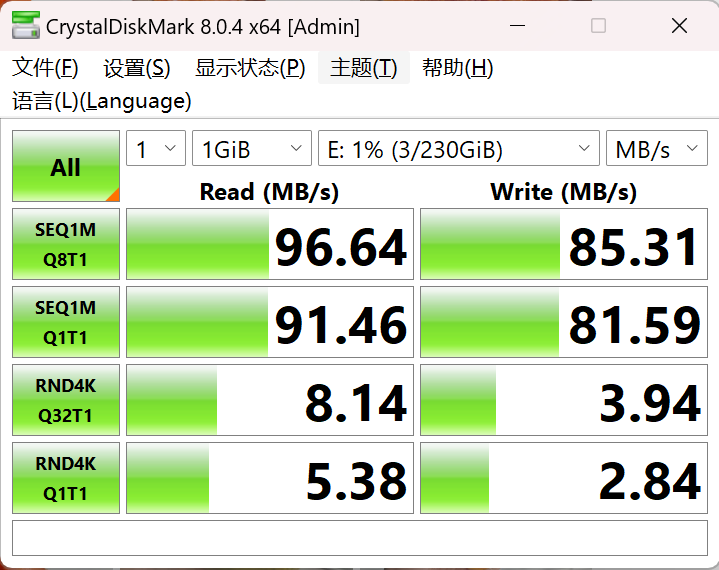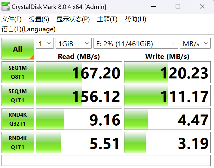 使用 CrystalDiskMark 测试的结果也很自然地略高一些,在 1 线程 8 队列的顺序读写测试之中几乎完全地跑出了理论中的速率上限,在写入方面完完整整地达到了 120MB/s,随机读写的测试成绩也相当不错。