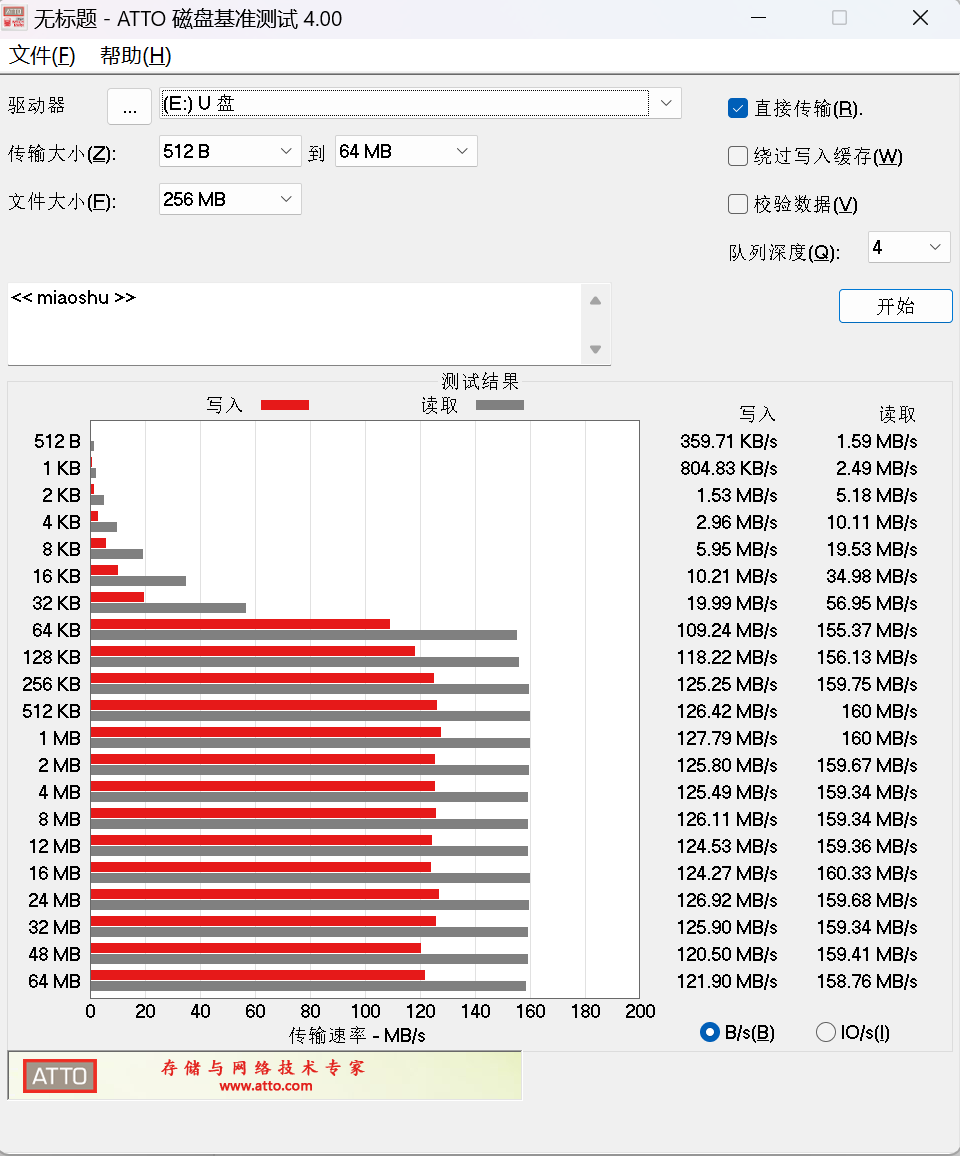 在 ATTO 磁盘基准测试中,致态 PRO 专业高速存储卡的表现也是相当稳定且迅速,写入的测试成绩也是能略微超过120MB/s 的速率上限,读取的速率则是能稳定在 160MB/s 左右,跟宣传的成绩还是比较相符的。