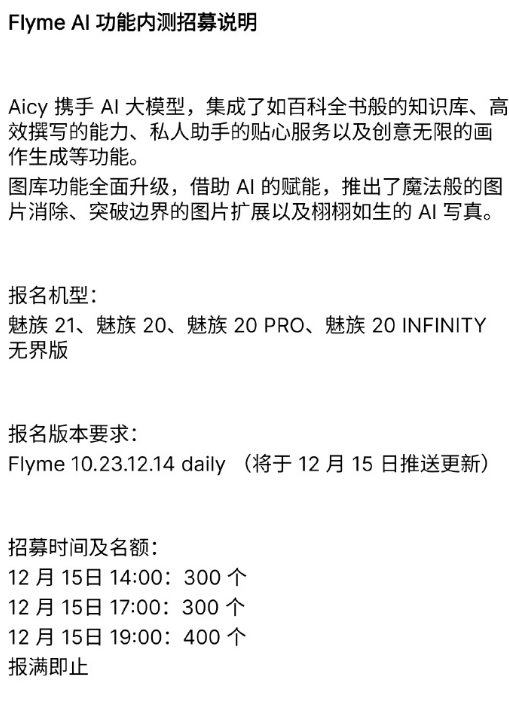 站长之家12月15日 消息:魅族手机宣布正式开启Flyme AI功能的内测招募。此次招募涵盖了魅族21、魅族20、魅族20PRO和魅族20INFINITY无界版等多款机型。报名者需要使用Flyme10.23.12.14daily版本。