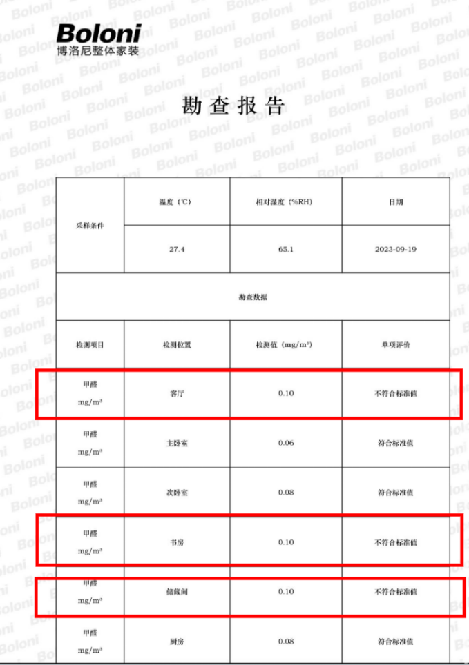 此后,博洛尼指定环保公司上门检测,报告显示房屋六个点位中三个点位甲醛测试超标,还有两个点位刚刚达到国家标准线。消费者说“检测结果出来后,博洛尼公司给出的解决方案是‘上门除醛’。公司一味推卸责任,针对此问题至今沟通无果。”