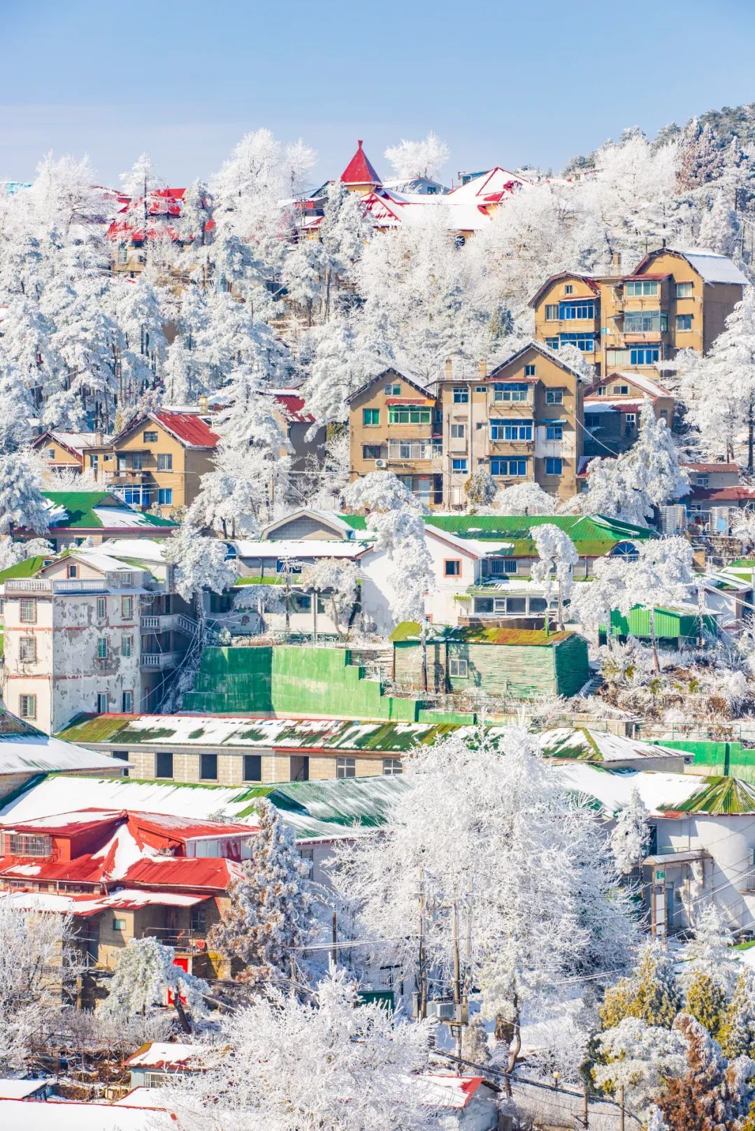 但冬天来到牯岭镇,你会看到600多栋五彩的西式别墅被银装素裹的绝美景象。下雪后的小镇,宛如云端之上的天上街市。
