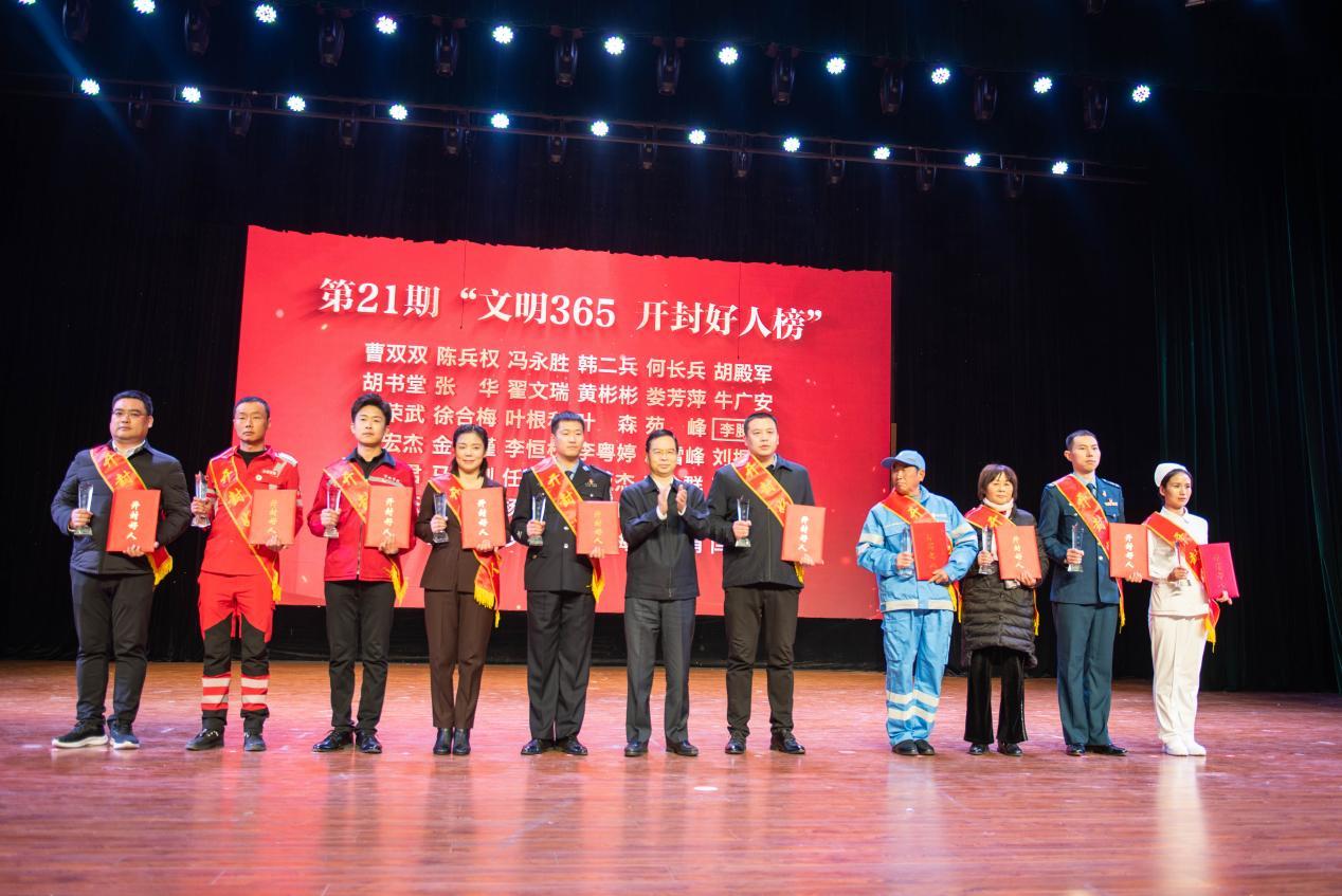 开封市委书记高建军为第21期“开封好人”代表颁发奖杯和证书。“文明365 开封好人榜”一月一主题、一期一特色,让越来越多好人得到全社会的礼敬和礼遇。市委常委、市委秘书长张松文为“文明365 开封好人榜”选树工作先进集体颁发奖牌。市委常委、市委宣传部部长邵华为“汴地好人”故事汇演特等奖获得者颁发荣誉证书和奖杯。