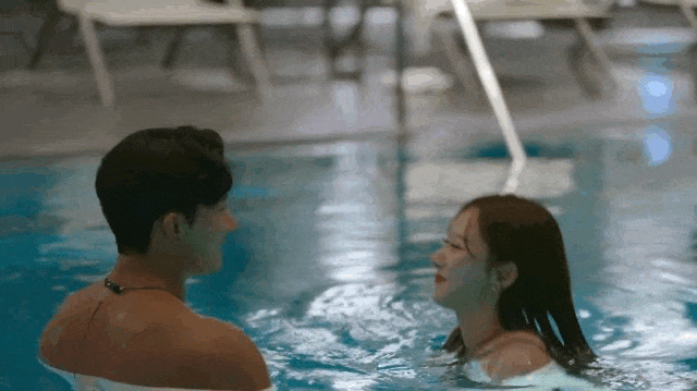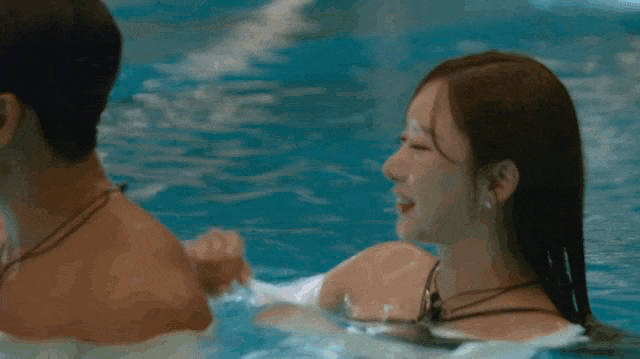 搞笑女(女二)和自信哥(男三)在泳池里嬉戏泼水,后再来一个眼神娇嗔。