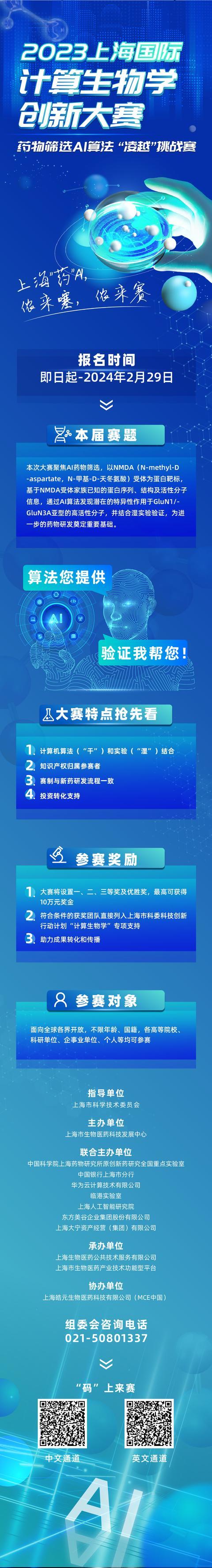 大赛邀请具有创新能力的企业或个人报名参赛,不限地域,将在未来9个月内通过逐级遴选产生优胜团队,并在2024浦江创新论坛期间颁奖。符合条件的获奖团队将直接纳入上海市科技创新行动计划“计算生物学”专项,得到后续支持。大赛还提供培训辅导、成果转化与孵化、投融资对接等服务,赋能参赛团队创新发展。