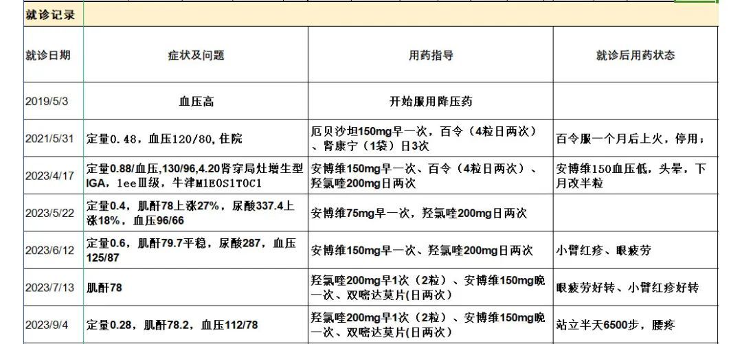 IgA肾病变化多端:一开始作者体检有血尿,尿蛋白轻微异常,中间一段时间尿常规血尿蛋白尿正常,后来又出现高血压,血尿合并尿蛋白定量>0.5g,进行肾穿刺确诊病理后规律治疗。