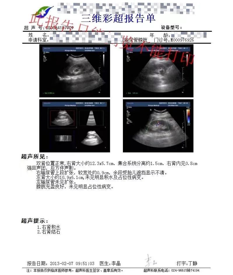 当时在孕中期,超声结果:右肾积水,结石0.8cm,主治医生并没有明确是肾有问题,建议观察,生完孩子再复查。认为可能是结石引起潜血,并没有过多治疗。