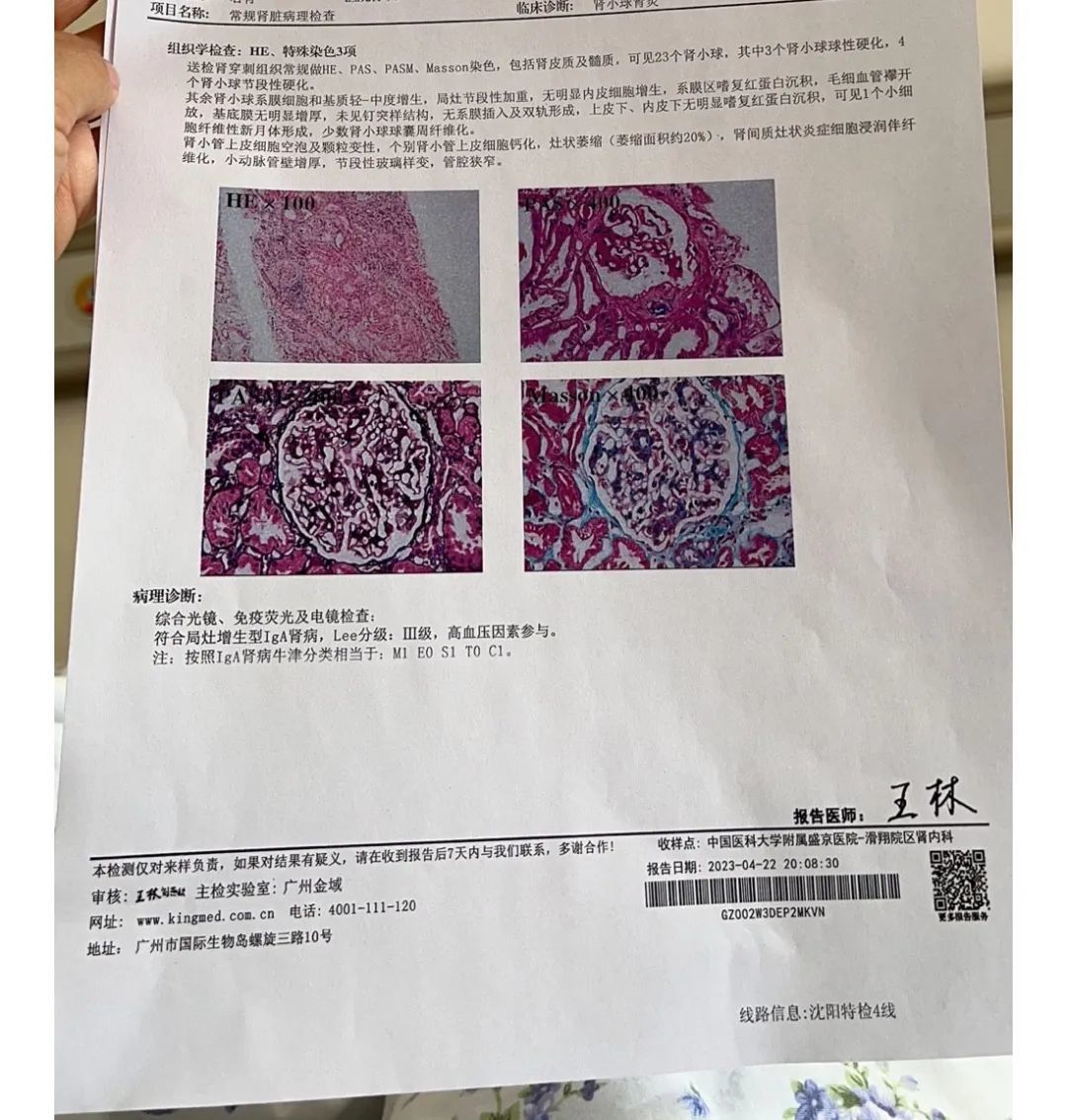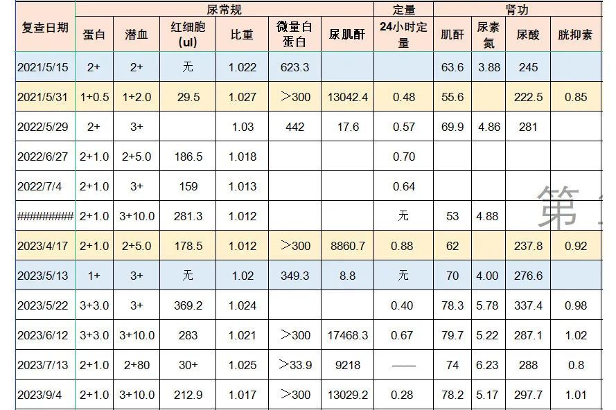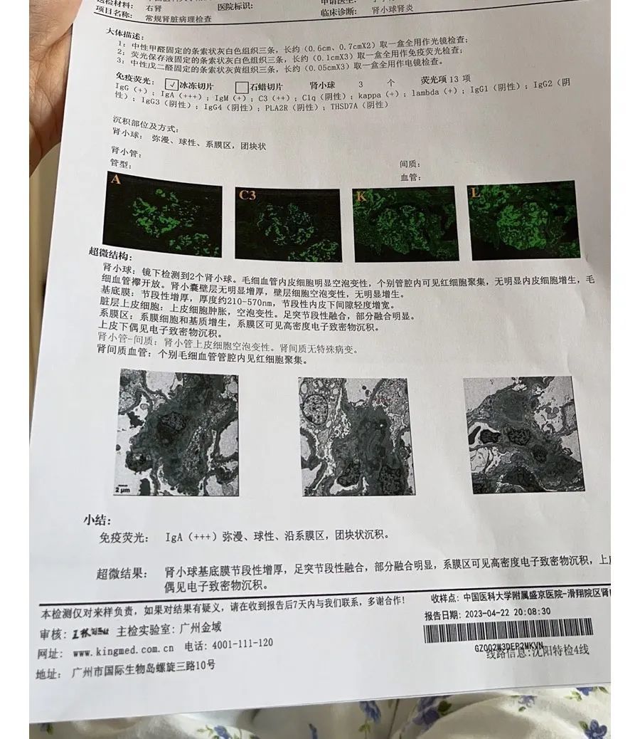 2.找对医生很重要。13年微量白蛋白、红细胞畸形率60%已经有征兆了,可能肌酐正常在肾内科不是严重型的,医生也没过多交代。再有19年因血压高在心内科住院,同是内科但也没提出肾病问题。直到21年,在盛京医院在何平主任那,听了我的描述,安排当天住院全身检查,我才清楚了解自己是什么病;包括今年肾穿虽然定量没达到1g,也是她建议我做的,明确病型,真的很感谢我的主治医生。