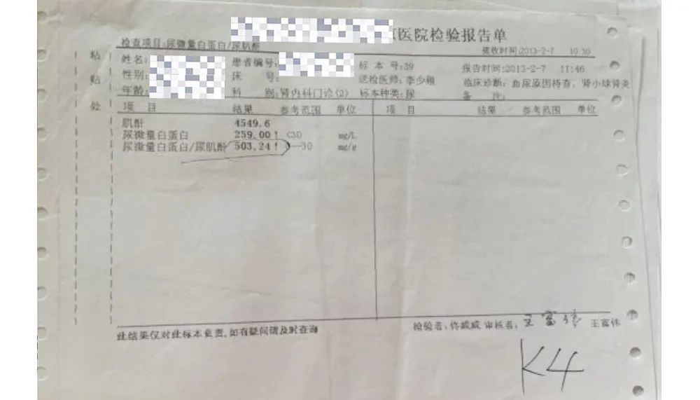 2013年2月怀孕期化验,隐血2+,尿白蛋白503mg/g,肌酐39umol/l(怀孕期生理性下降),右肾结石和积水