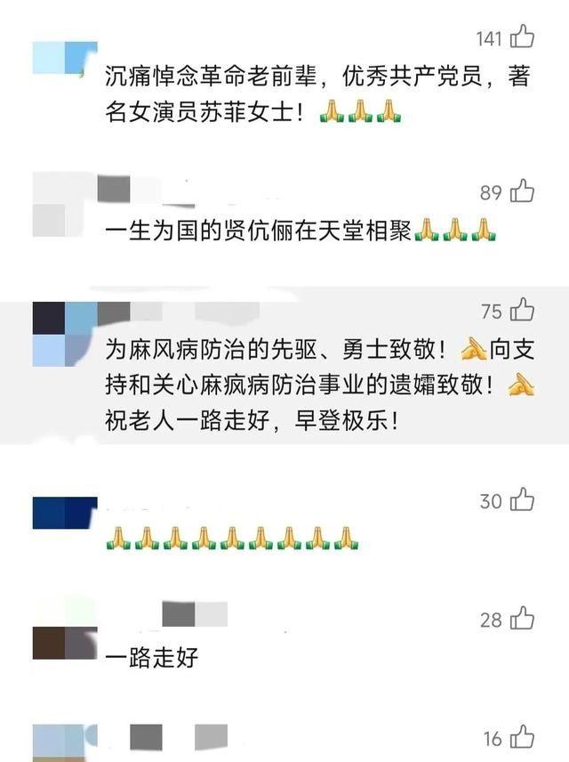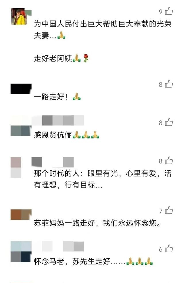 苏菲女士儿子周幼马在她身边为她送终,“母亲是在睡梦中平静走的,脸上带着微笑。”苏菲女士生前叮嘱家人千万不要麻烦大家为她后事来操心,一切平平静静。