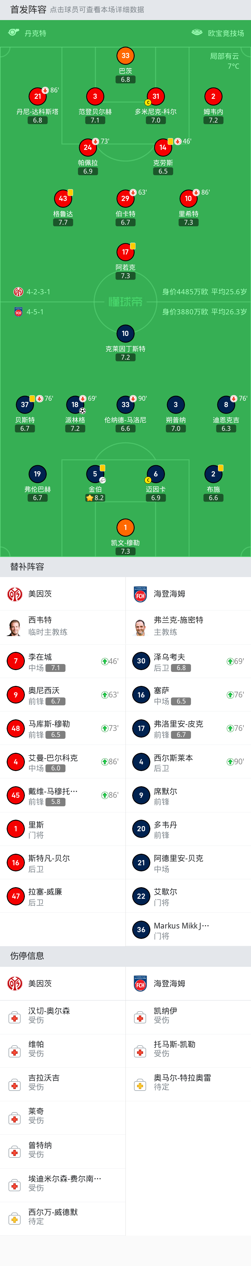 美因茨首发:33-巴茨, 2-姆韦内, 21-丹尼-达科斯塔, 31-多米尼克-科尔, 17-阿若克, 10-里希特, 3-范登贝尔赫, 29-伯卡特, 14-克劳斯, 24-帕佩拉, 43-格鲁达