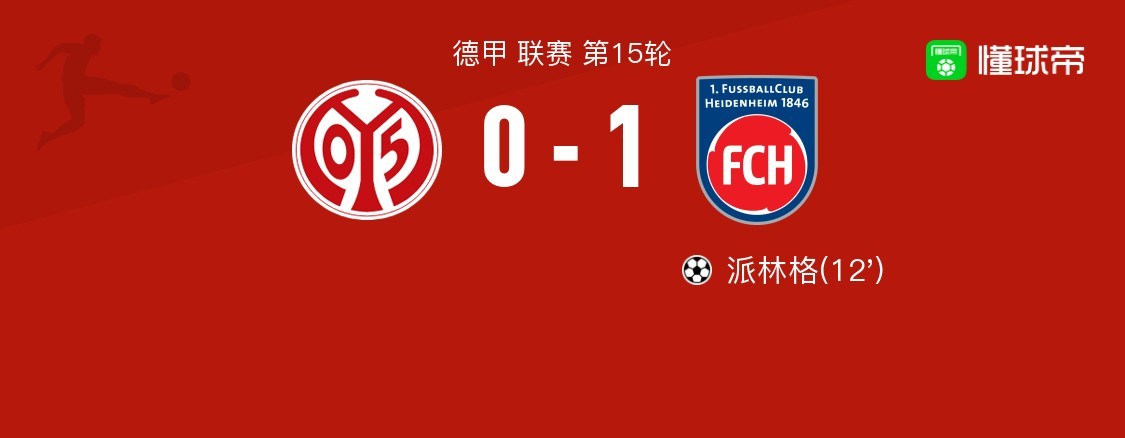 北京时间12月16日德甲 联赛 第15轮,美因茨主场对阵海登海姆。美因茨。海登海姆派林格破门。最终比分0-1。